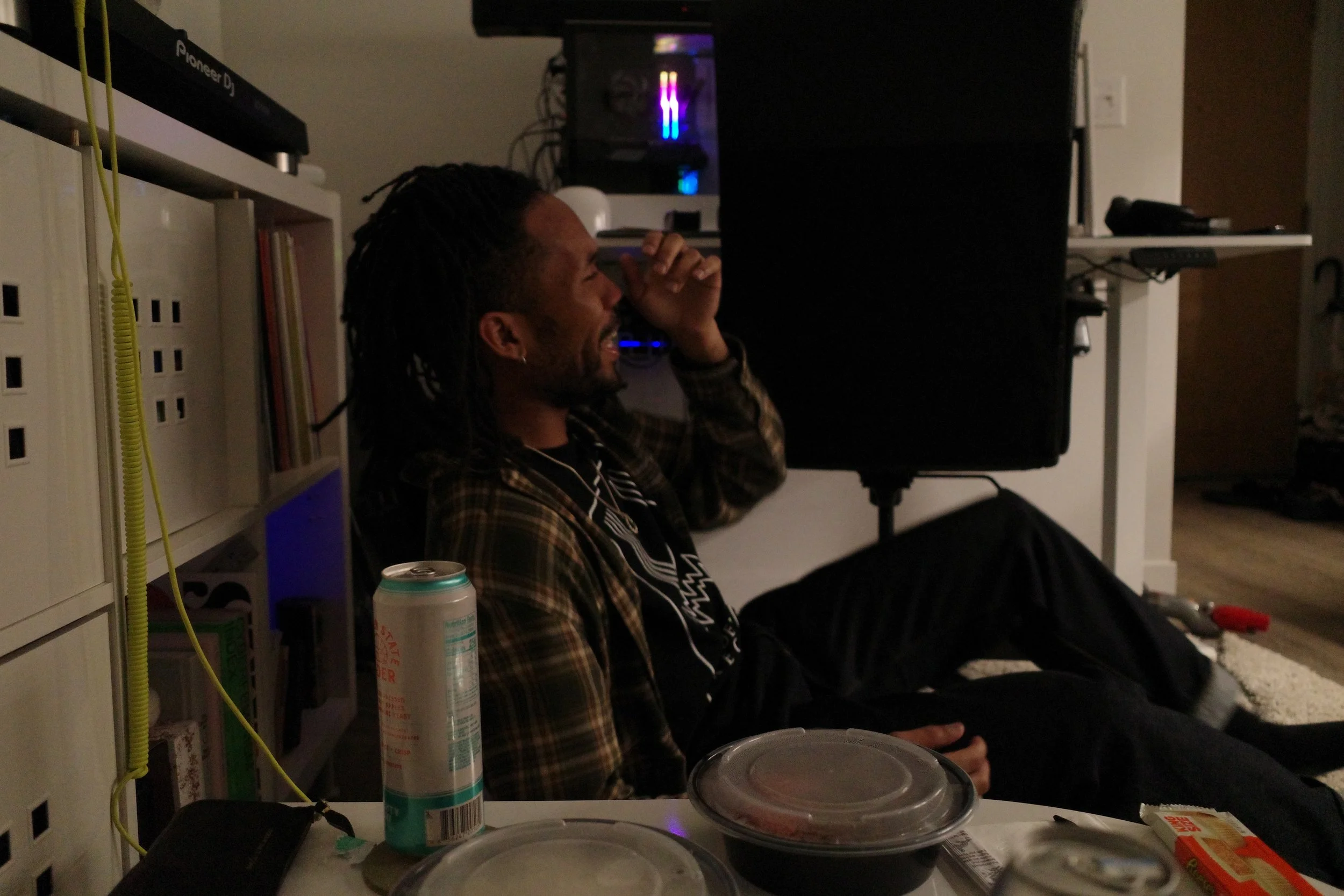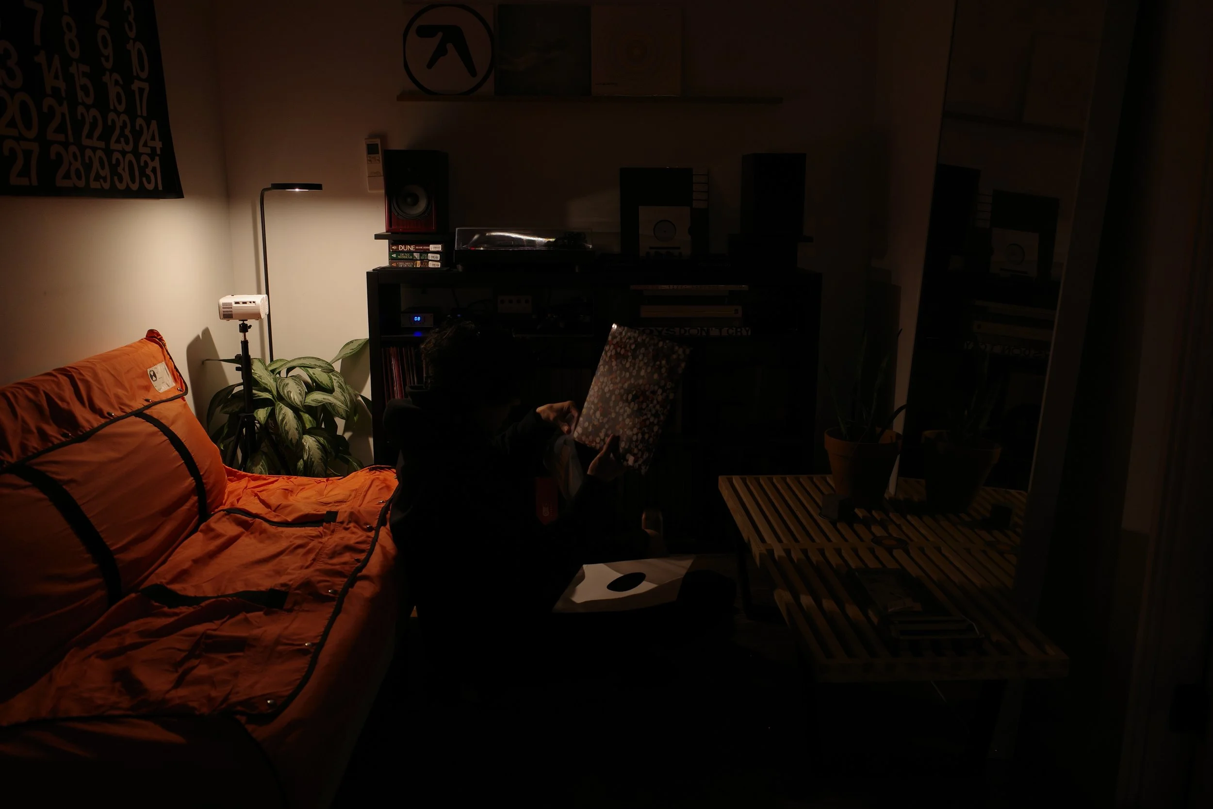 When I wake up, the first thing I do is put on music in my living room, and Nick’s home reminded me of myself and my living situation. Anything that gets me moving, makes my body shake, something to wake me up since caffeine doesn’t cut it anymore and my tolerance is shot to high heaven. Nick’s Bushwick apartment features a living room with that same intentionality, records of different genres neatly stuffed in a KALLAX bookshelf with a record player on its Swedish noggin. I knew we were on the same wavelength after we shared Four Tet tracks with one another, months prior to this night, so I knew I wanted to capture him sorting music that he loved. I love how tangible that passion we have for music, and how it makes us feel, is in this photo.