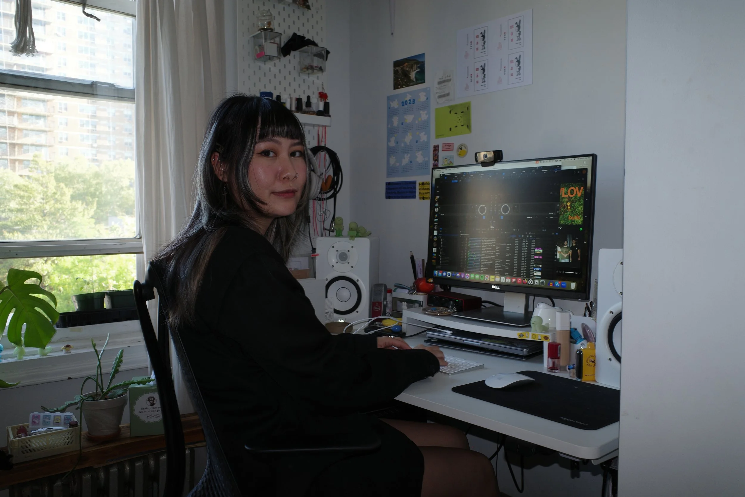 I asked Tiff to face me while she sat at her workstation, foregoing my usual preference of shooting with the subject unaware of me. I showed her my camera screen and she responded, saying “I don’t like how my arm looks actually, let me put my jacket on”. I resumed my squat on her bed after she passed her arms through sleeves, and I pressed the shutter. “Yeah, that’s the one”.